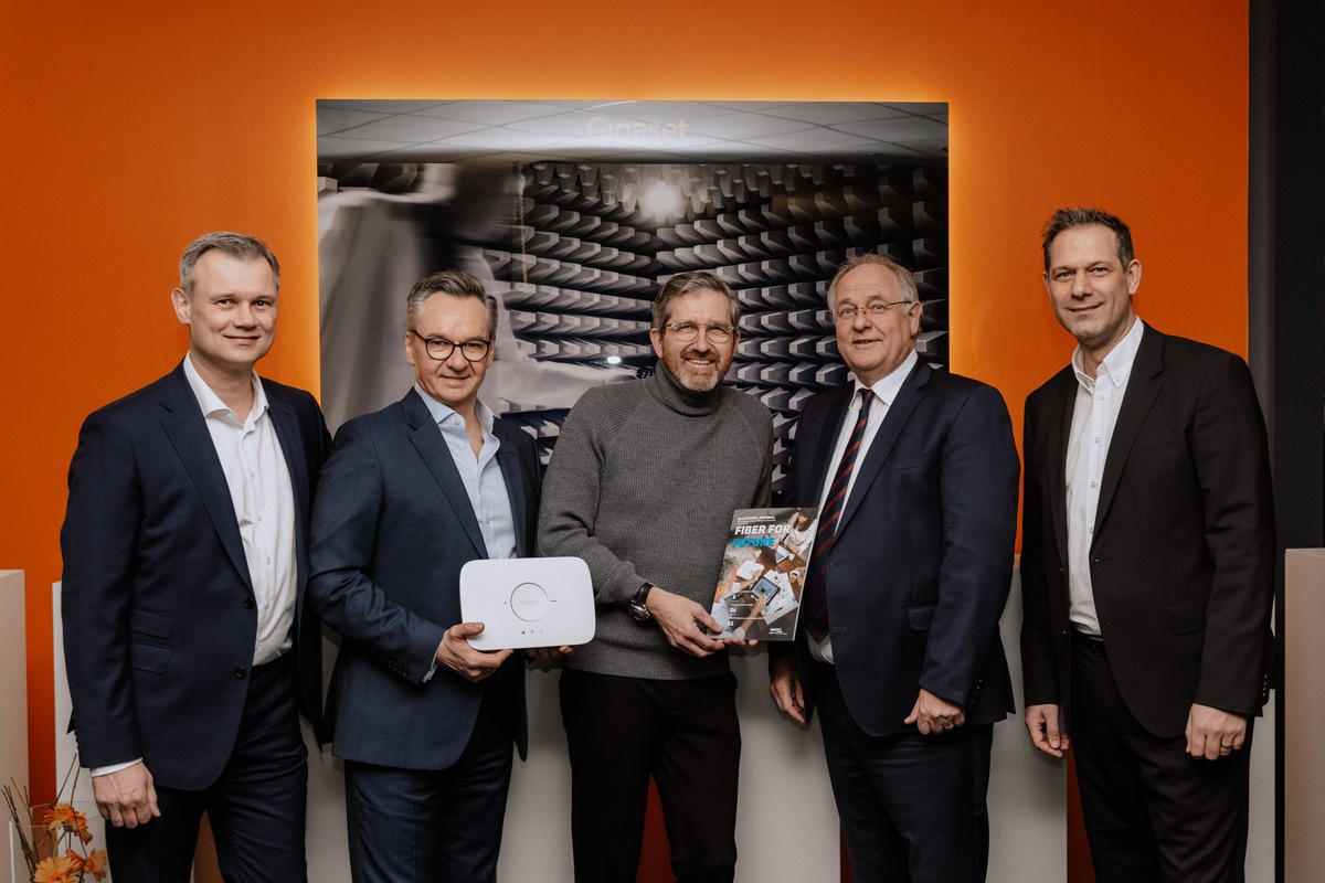 Neue Kooperation soll Routerknappheit entschärfen und Engpässe im Glasfaserausbau verhindern / Bei Kooperationsunterzeichnung v.l.n.r Karsten Schmidt, Geschäftsführer htp Germany, Vorstandsmitglied BREKO, Jürgen Magull, Geschäftsführer BREKO Einkaufsgemeinschaft eG, Dr. Stephan Albers, Geschäftsführer Bundesverband Breitbandkommunikation (BREKO), Aufsichtsrat BREKO eG, Klaus Weßing, CEO und Vorstandsvorsitzende Gigaset, Ralph Lueb, Senior Vice President Global Sales Gigaset / Weiterer Text über ots und www.presseportal.de/nr/57418 / Die Verwendung dieses Bildes ist für redaktionelle Zwecke unter Beachtung ggf. genannter Nutzungsbedingungen honorarfrei. Veröffentlichung bitte mit Bildrechte-Hinweis.