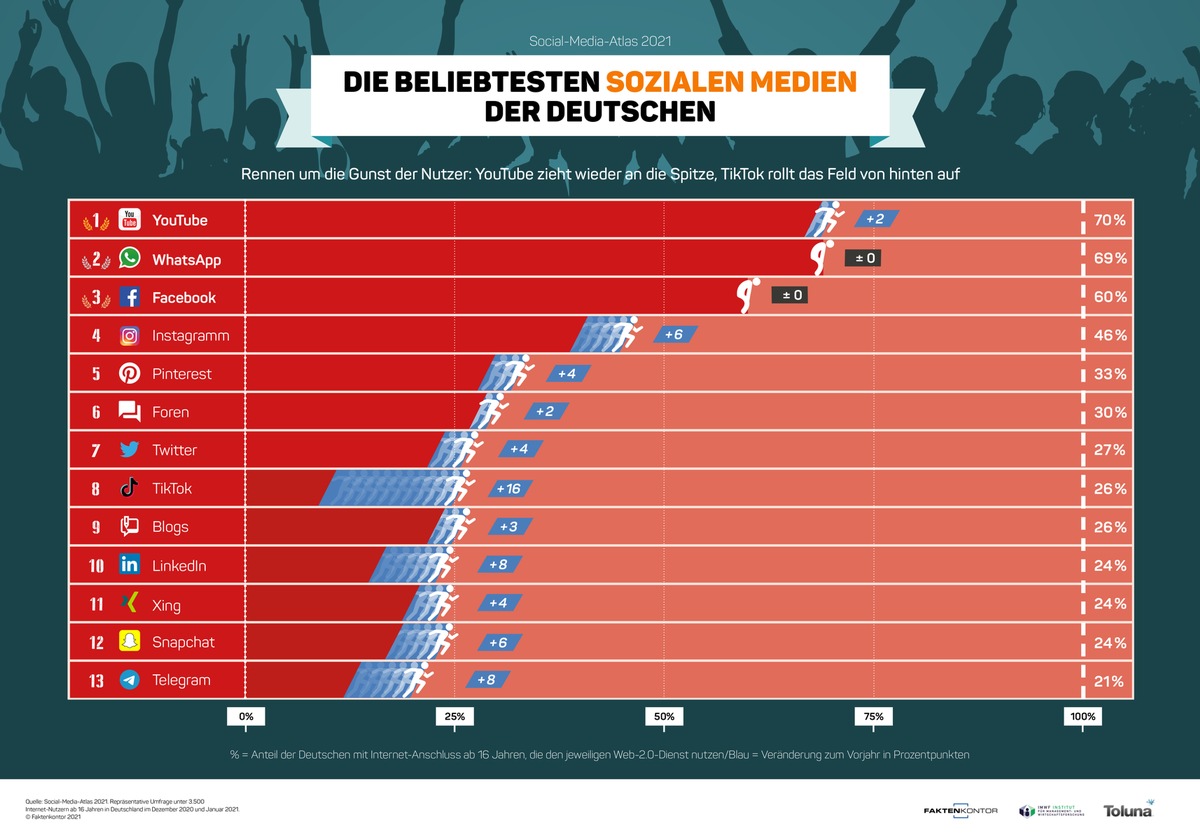 Hamburg (ots) – YouTube hat sich die Krone des beliebtesten Social-Media-Dienstes zurückerobert: Sieben von zehn Onlinern ab 16 Jahren nutzen aktuell Googles Do-it-yourself-Videoportal. Nur zwei Prozentpunkte mehr als im Vorjahr – aber das reicht, um den Social-Media-Thron von WhatsApp zurückzuerobern. Der Marktanteil des Messengers aus dem Hause Zuckerberg liegt unverändert bei 69 Prozent. Auf dem dritten Rang folgt als Plattform der älteren User Facebook, das weiterhin von 60 Prozent genutzt wird. Während die „großen Drei“ damit weitgehend auf der Stelle treten, konnten die kleineren Dienste ihre Nutzergemeinden überdurchschnittlich ausbauen. Das zeigt der aktuelle Social-Media-Atlas 2021 der Hamburger Kommunikationsberatung Faktenkontor und des Marktforschers Toluna, für den 3.500 Internet-Nutzer repräsentativ befragt wurden.