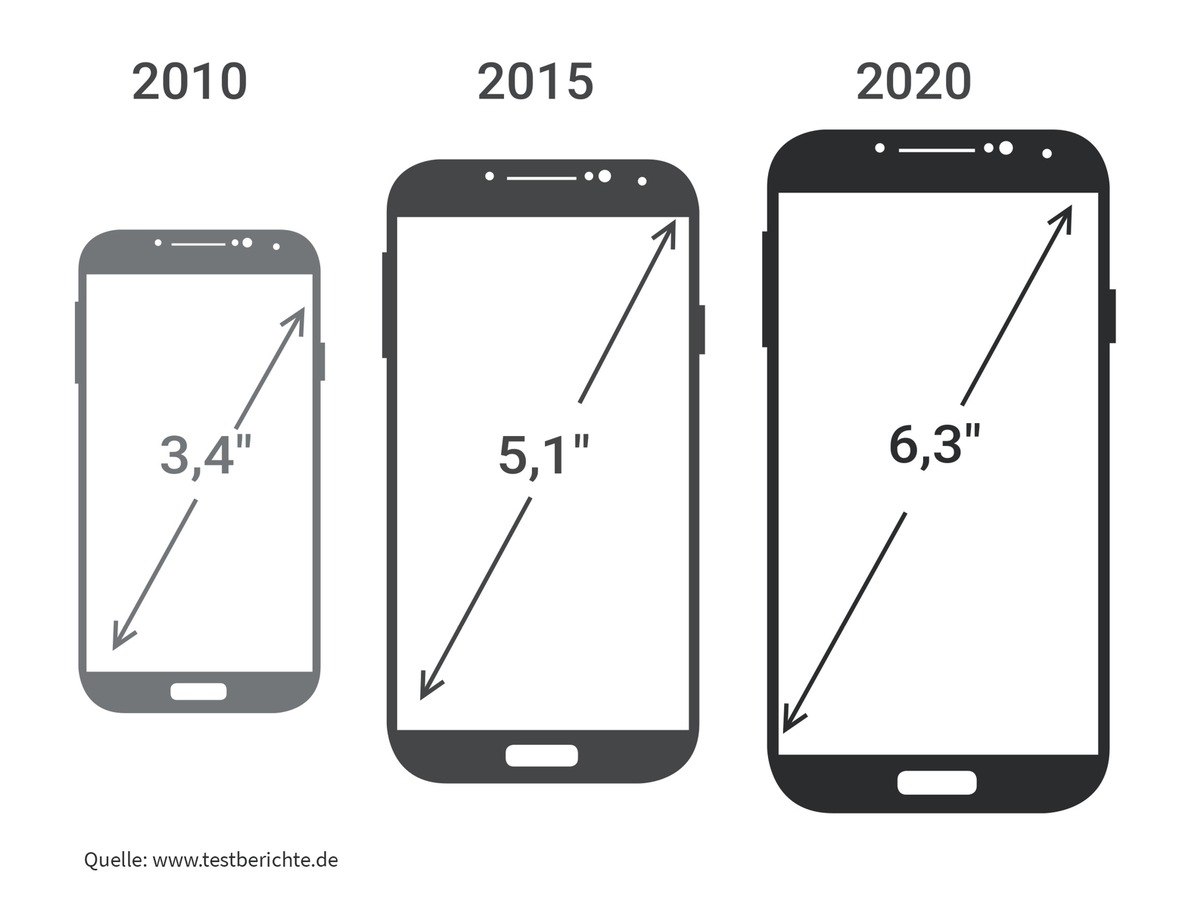 2010 maß die Bildschirmdiagonale von Smartphones durchschnittlich 3,4 Zoll (8,5 cm), fünf Jahre später waren es 5,1 Zoll (13 cm) und mittlerweile liegt der Wert bei stolzen 6,3 Zoll (16 cm). Wer dachte, der Trend zur stetig wachsenden Handygröße würde gestoppt, bevor die Geräte das Hosentaschenformat sprengen, sieht sich getäuscht: Die Displays der Highend-Geräte bringen es mittlerweile auf 6,7 Zoll (17 cm), sogar die preisgünstigen Einsteiger-Modelle kommen auf gut 6 Zoll (über 15 cm).